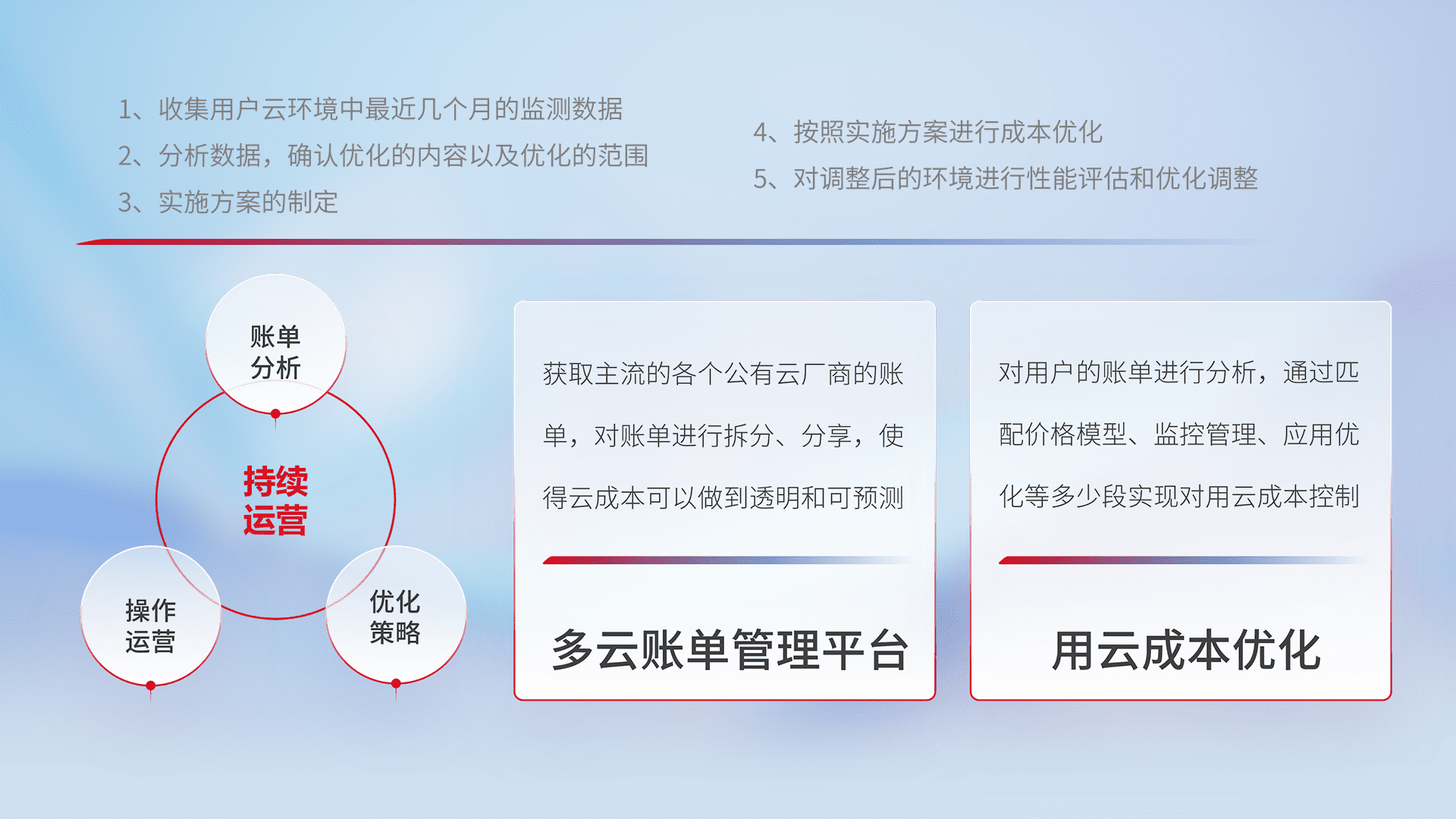 通过多云纳管,,,,以统一的资源数据模型把客户的云资源进行抽象和封装,,进而实现对多云资源的统一操作,,,保障云资源管理的可靠性、、稳定性与可用性。。量身定制化运维内容,,,配置、、、、开发运维、、、、补丁管理、、、、备份、、、、监控、、认证和访问管理、、、审计和日常巡检等,,,保障在用云过程中的可靠度,,稳定度以及高可用率。。